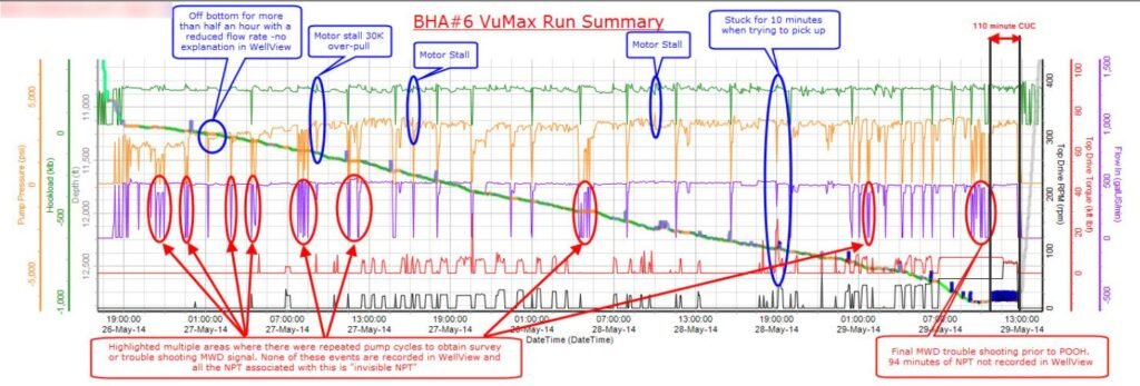 Through VuMaxPro visualization, multiple on-bottom dysfunctions—previously unreported in daily drilling reports—were identified instantly using a single integrated view.